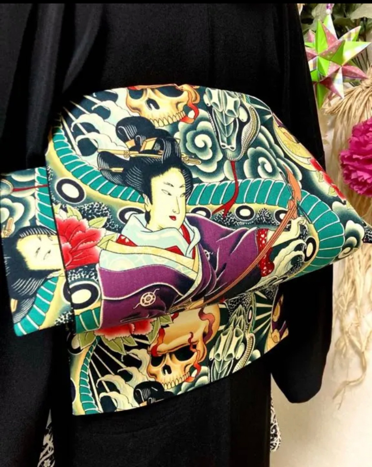 芸者と髑髏柄の名古屋帯です。