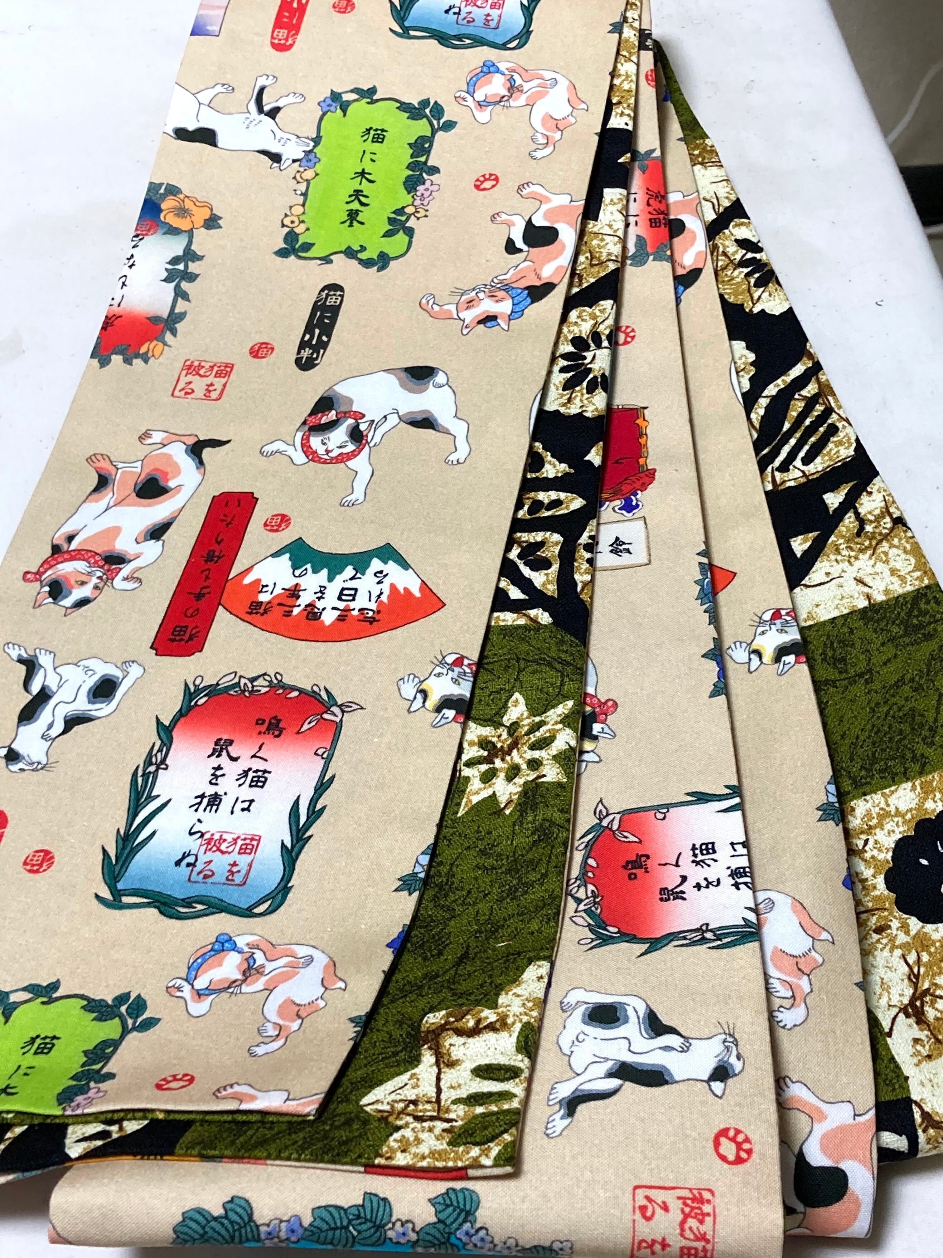 浮世絵猫と猫のことわざ柄のユニークな半幅帯です。
